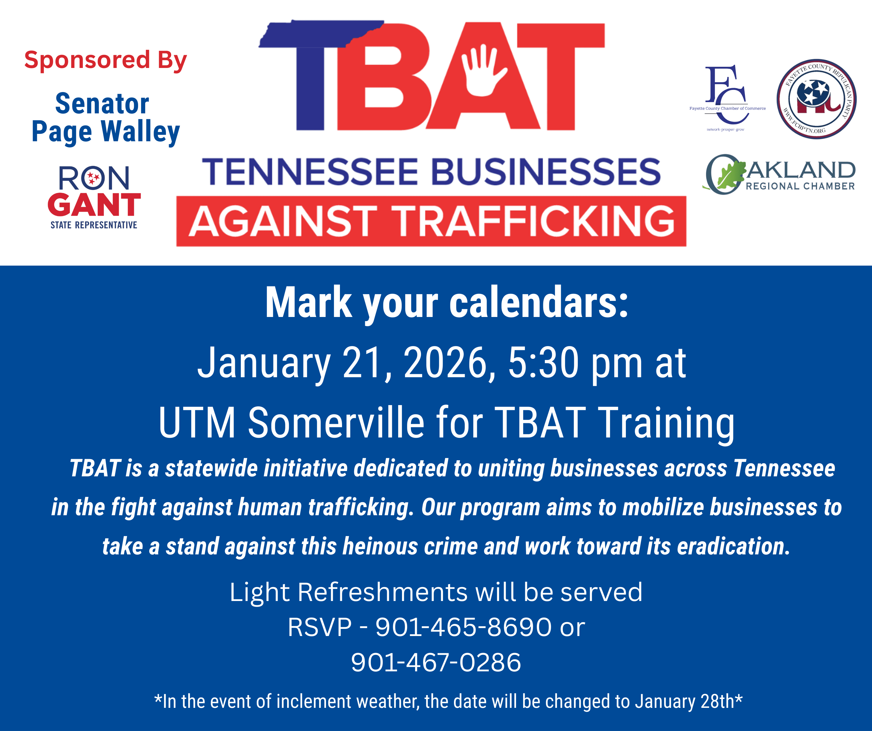 When we hear of human trafficking we often assume it is victims coming over the border in tandem with sex trafficking. The latest statistics show that our assumptions are wrong. Based on the statistics of those caught and prosecuted, 58% of victims are trafficked within their own country. This means most trafficked individuals are United States citizens. Victims of trafficking for labor purposes has surpassed sexual trafficking as of 2022 and the number of minors being trafficked is double that of adults. In 2023 there were 210 known victims (known victims, not the actual number of victims) of trafficking in the state of Tennessee. It is happening right under our noses and though most of us would do anything to stop this horrific trade from continuing, we just don't know what we're looking for. That's where our elected officials, both past and present come in. They are committed to joining forces with businesses to put a stop to this tragedy. There will be a training offered on January 21, 2026 (January 28th in case of inclement weather) at UT Martin Somerville. Training is free! Thank you for being willing to help stop human trafficking in all forms and from all locations.